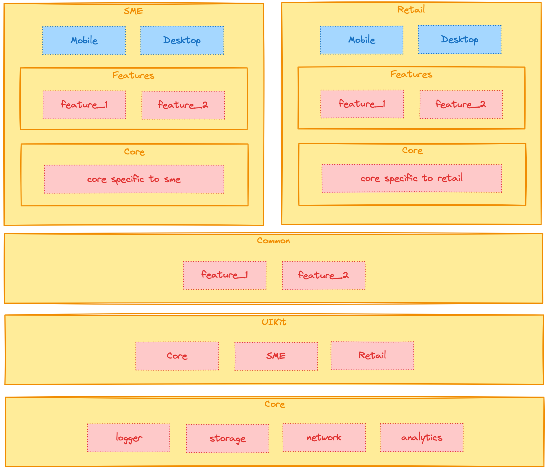 First of all, let's take a look at the architecture of our modules. Globally, we have core, uikit and of course feature packages. But each product can also have its own core and feature packages. This way we can independently deliver new features, remove and also refactor them with ease. If we go deeper, there are 3-4 more packages inside of each feature package. impl, ui, ui_desktop packages contain unit tests, hence by considering the fact that we have more than 500 packages in the monorepo, you may understand the problem. We are losing a lot of time in our pipelines. Also because of tests taking significant time, we have very huge queues which are causing the second problem of available resources, hence developers can see messages in Pipeline like: