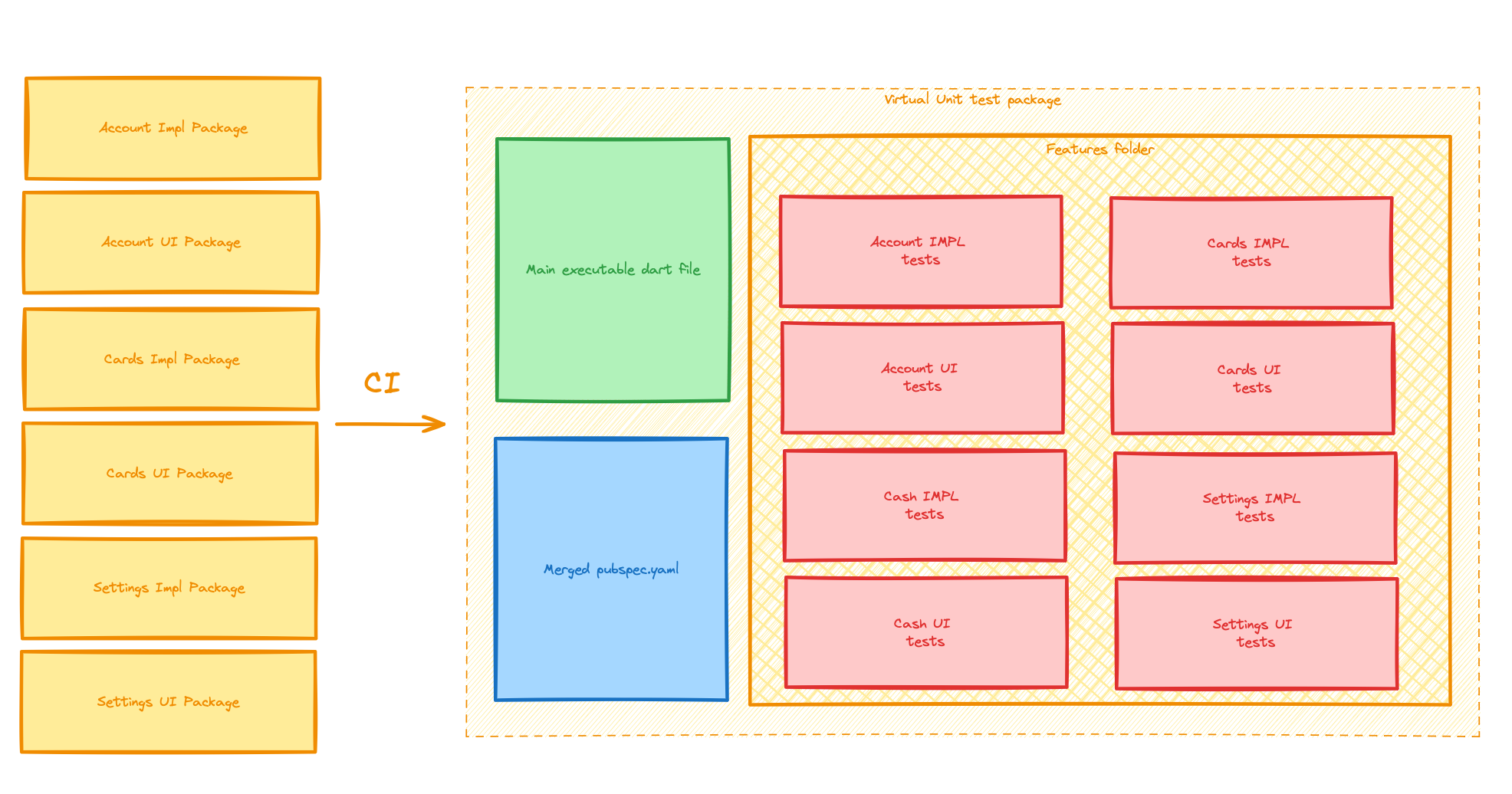 We thought that probably in CI some virtual package with all the unit tests could be set up to speed up everything. It’s possible because we have standard versions of dependencies across the monorepo which means that we are not going to face conflicts. Also, we are going to cache most of the libraries, and dependencies in the precompiled file once. No need to create isolates, servers, and sockets again and again for every package. So that was the idea behind our new script.